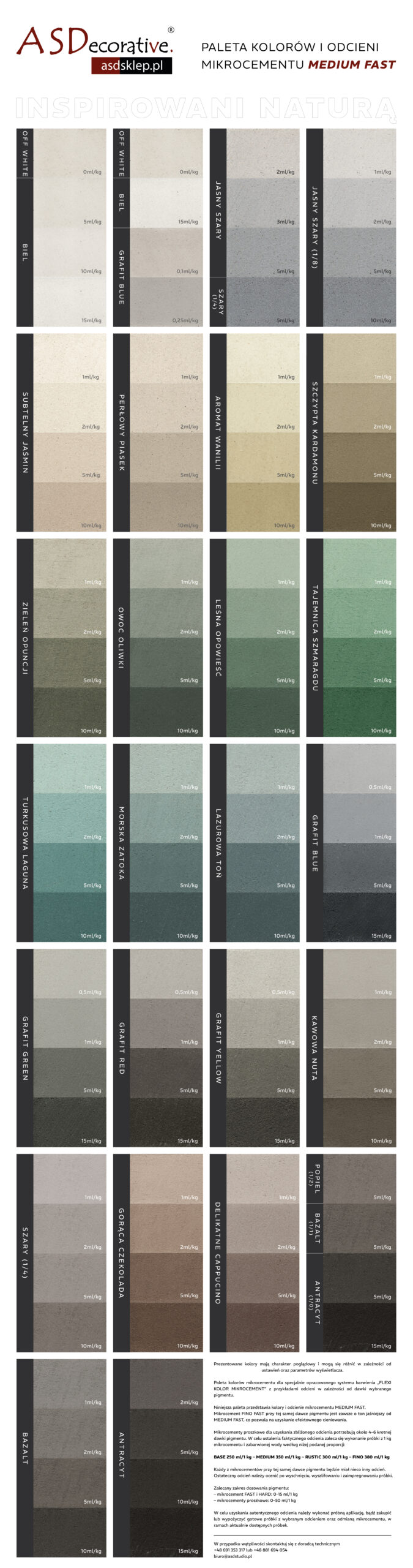 * Odcień każdego koloru można dowolnie rozjaśniać zmniejszając ilość dozowanego pigmentu, lub przyciemnić, nie przekraczając dawki: 15ml/1kg dla mikrocementów FAST oraz 50ml/1kg dla mikrocementów proszkowych