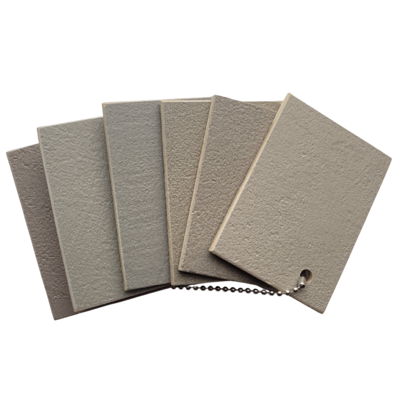 W palecie zaprezentowano próbki wykonane z mikrocementu FINO FAST oraz MEDIUM FAST. Na odwrocie każdego wzornika znajduje się etykieta z nazwą handlową użytego pigmentu,  dawka pigmentu potrzebna dla uzyskania danego koloru.