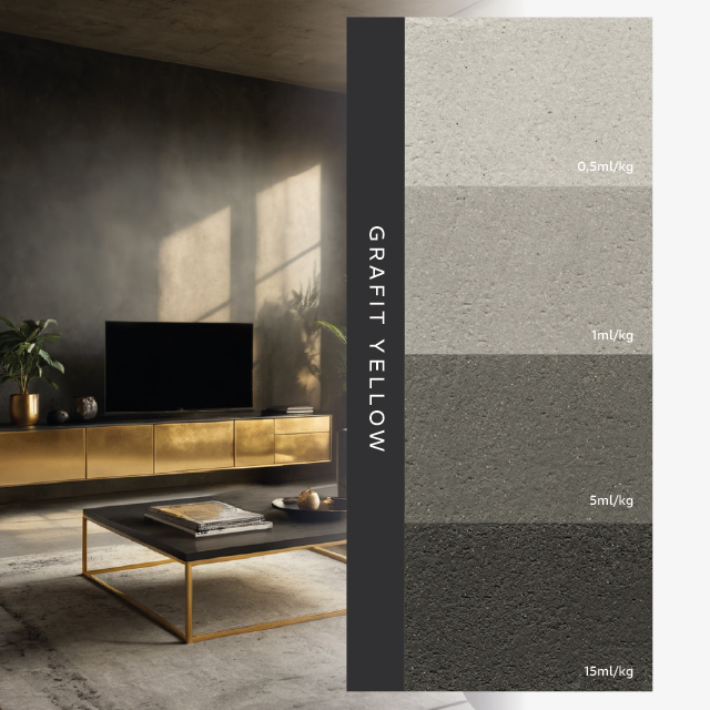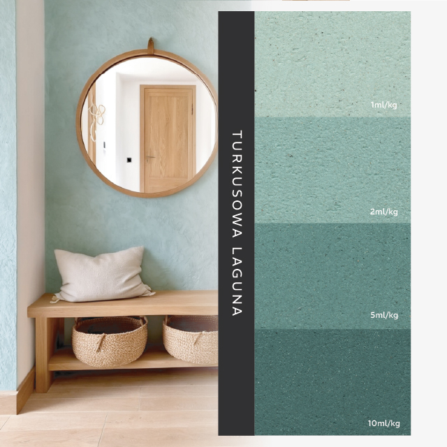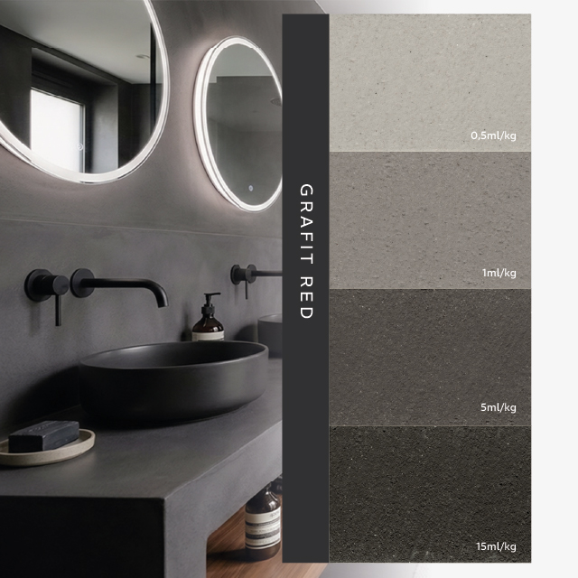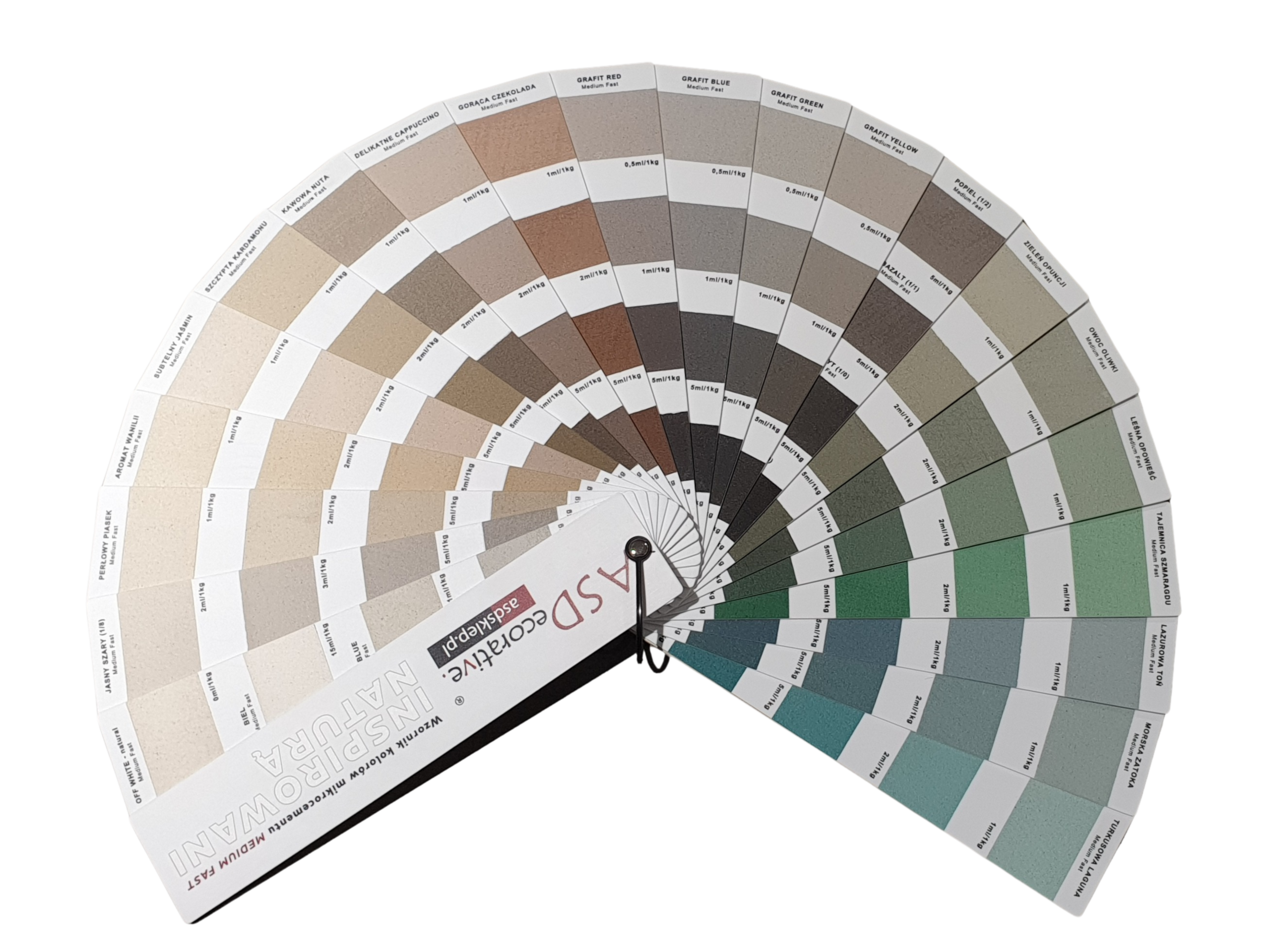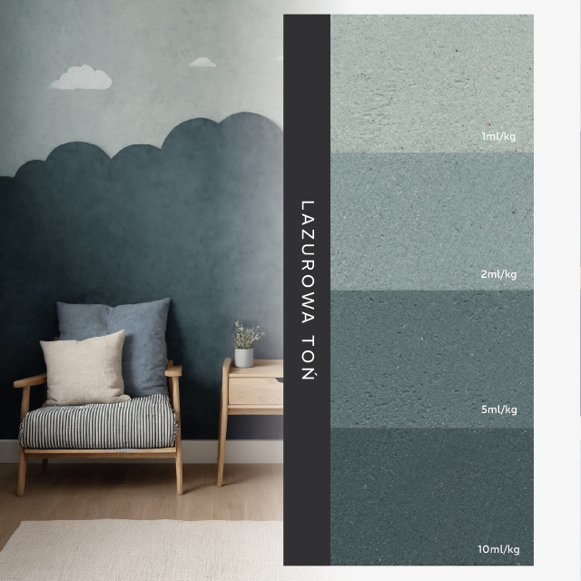 Ostateczny kolor aplikacji może delikatnie różnić się od zaprezentowanego we wzorniku w zależności od rodzaju barwionego mikrocementu, techniki wykonywania oraz warunków specyficznych dla konkretnej realizacji.